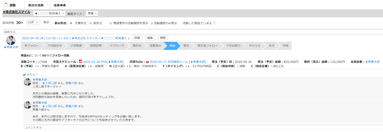 メンバーからの報告・連絡・相談の際にeセールスマネージャーを活用すれば、チャット形式のタイムラインで、マネージャーからのアドバイスやアシスタントへの指示、他部署への情報共有などをリアルタイムに行うことができ、コミュニケーションロスの発生を防げます。