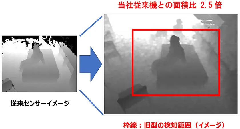 従来のネオスケアから距離センサーの性能を、広角、遠距離に変更しました。その結果、従来のベッド周辺での見守り性能や操作性はそのままに、居室内のより広い範囲の見守り(転倒など)が可能となります。
