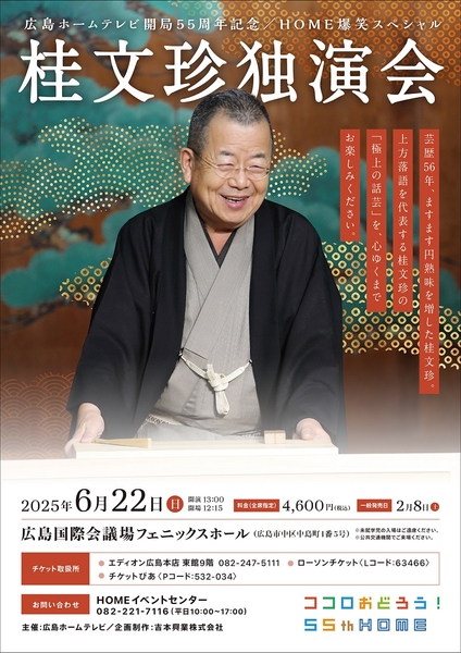 広島ホームテレビ(所在地:広島県広島市)は、主催で2025年6月22日(日)「広島ホームテレビ開局55周年記念 HOME爆笑スペシャル 桂文珍独演会」を広島国際会議場フェニックスホールで開催します。上方落語を代表する桂文珍の「極上話芸」。抜群のセンスと庶民派の個性あふれる最上級の笑い!