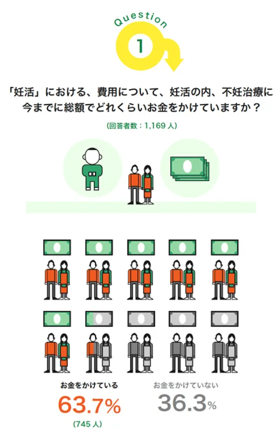今回の調査では、妊活をしている方の63.7%が不妊治療にお金をかけており、お金をかけている夫婦の7組に1組(14.4%)が不妊治療に100万円以上出費していることが明らかになりました。