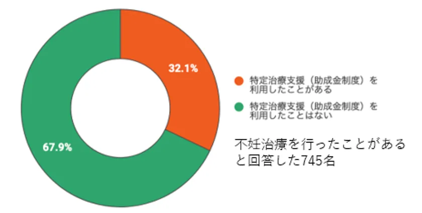 また、不妊治療にお金をかけている夫婦のうち「特定治療支援(助成金制度)*」を利用したことがあるのは32.1%でした。特定治療支援が適用されるのは、特定の不妊治療(体外受精や顕微受精など)でなければ妊娠が難しい方です。そのため、この結果から、不妊治療を行う夫婦の約3分の1が特に深刻な悩みを抱えていることが伺えます。