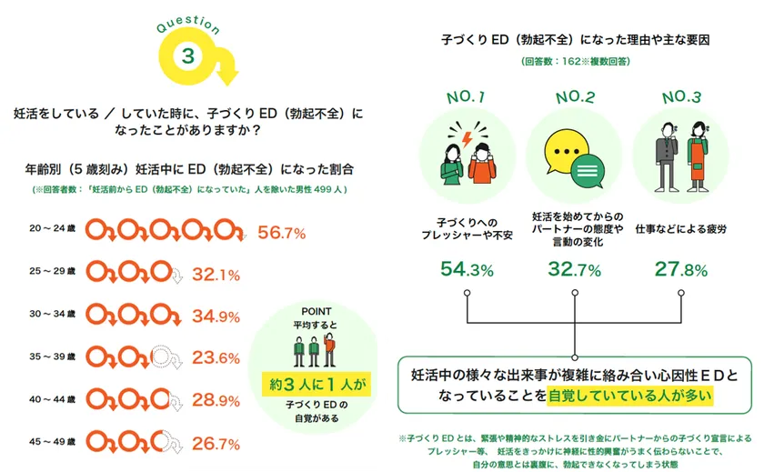 EDの原因には、身体的なものと精神的なものがありますが、身体的問題を抱えることの少ない若い世代が最も悩みを抱えているという結果からも、子づくり目的の義務的なセックスが精神的に大きな負担になってしまっていることが伺えます。