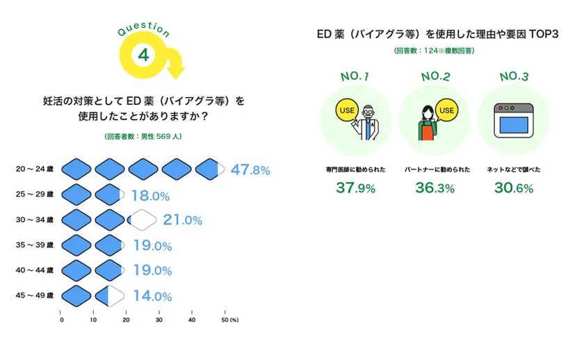 「妊活の対策としてED薬(バイアグラ薬等)を使用したことがありますか?」という質問では、20~24歳の使用率が47.8%と前項の「EDとなった」同様、ほかの世代よりも高いことが明らかになりました。(全年代平均 23.1%)
