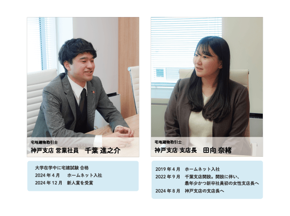 今回は、その過程で若手社員がどのような努力や挑戦を通じて成長しているのか、ホームネット神戸支店の2人に、若手が作り上げる企業風土「成長と挑戦」について伺いました。