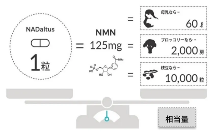 例えば、NADaltus1粒に含まれているのと同量である125mgのNMNを摂取するには、ブロッコリーなら2,000房、枝豆なら1万粒、母乳なら60L相当が必要となります。