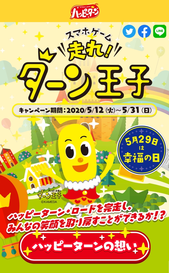 「ハッピーターン」は、こう(5)ふく(29)の語呂合わせで、5月29日の「幸福の日」に幸せ(ハッピー)がお客様に戻って来る(ターン)ことを願って、家にいながらでもスマートフォンで楽しめるオンラインゲーム「走れ!ターン王子」と共にオープンキャンペーンを実施いたします。