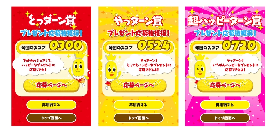 ※ハッピーターン公式 Twitter アカウント(@happyturnkameda)をフォローの上、ゲームプレイ後に表示される応募ページ内に記載の応募方法にしたがってTwitterでツイートして応募ください。