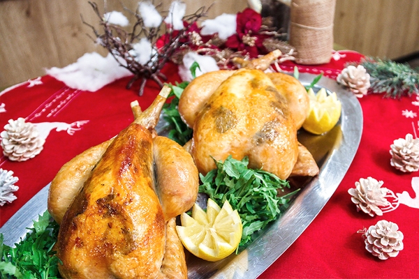 ご自宅で過ごすクリスマスを盛り上げるテイクアウト商品には、ご家族や大切な仲間と大人数でお召し上がりいただけるローストチキンを2種ご用意いたします。長野県限定生産の希少価値の高い地鶏”真田丸”の雛鳥と、天然ハーブで育った香り豊かな銘柄鶏の信州ハーブ鶏を贅沢にローストしました。