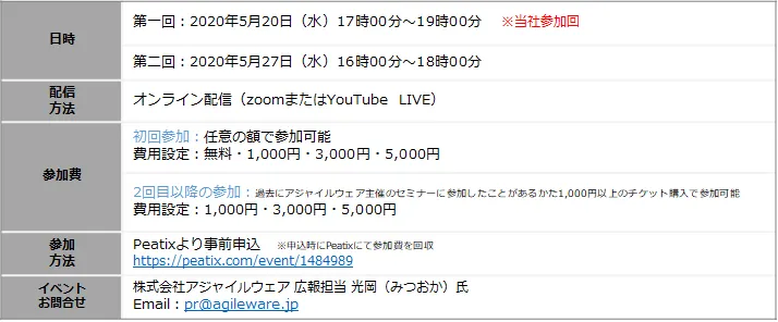 ※参加申し込み後、前日17時までにアクセスURLがアジャイルウェアより送付されます。