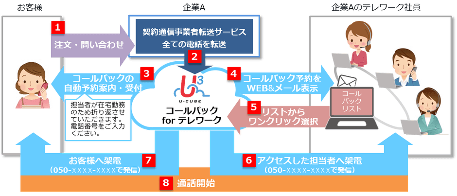 U³ コールバック for テレワークを介した通話で通話料は会社負担となり、社員個人の電話番号がお客様に知られることもありません。