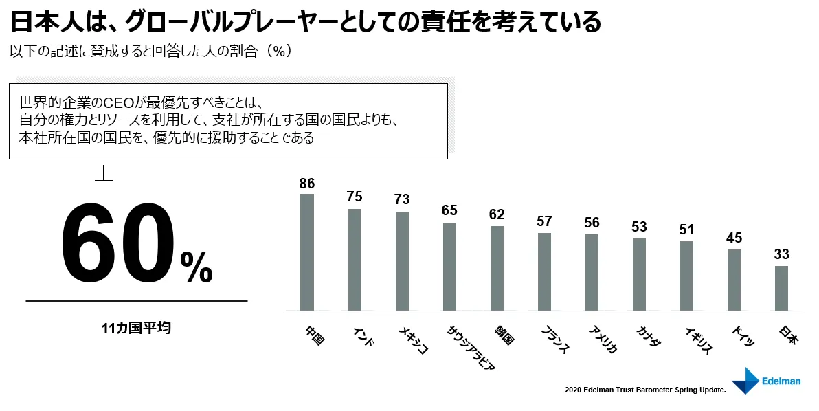 日本の回答者の60%が、CEOは政府から制約や要求が課されるまで待つことなく、パンデミックへの対応策を発動すべきであると考えている一方で、CEOがパンデミックの危機に対する要求に見事に対応できていると答えた人はわずか13%でした。興味深いことに、世界的企業のCEOが最優先すべきことは、自分の権力とリソースを利用して、支社が所在する国の国民よりも本社所在国の国民を、優先的に援助することであると答えた日本人回答者は3人に1人で、調査対象11カ国の中で最も低い結果となりました。