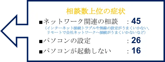 相談の内容は幅広くオンライン会議に伴い映像や音声がうまくつながらいといった相談や、リモート環境を整えるための相談、パソコンの挙動不良など、在宅勤務に伴い発生した想定外の問題を解決できず、さまざまな相談が寄せられました。