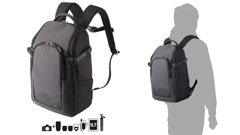 高い収納力を持ったデイパックスタイルのカメラバックパックです。シンプルな1気室構造のカメラ収納部は、ファスナーで全開できるので機材の一覧性に優れ、出し入れも容易に行えます。仕切り方次第で、カメラと一緒に小型のドローンやコントローラー等も収納が可能です。前面開口の1気室ながら上部まで回り込んだファスナーにより、天面から素早くカメラを取り出すことができます。