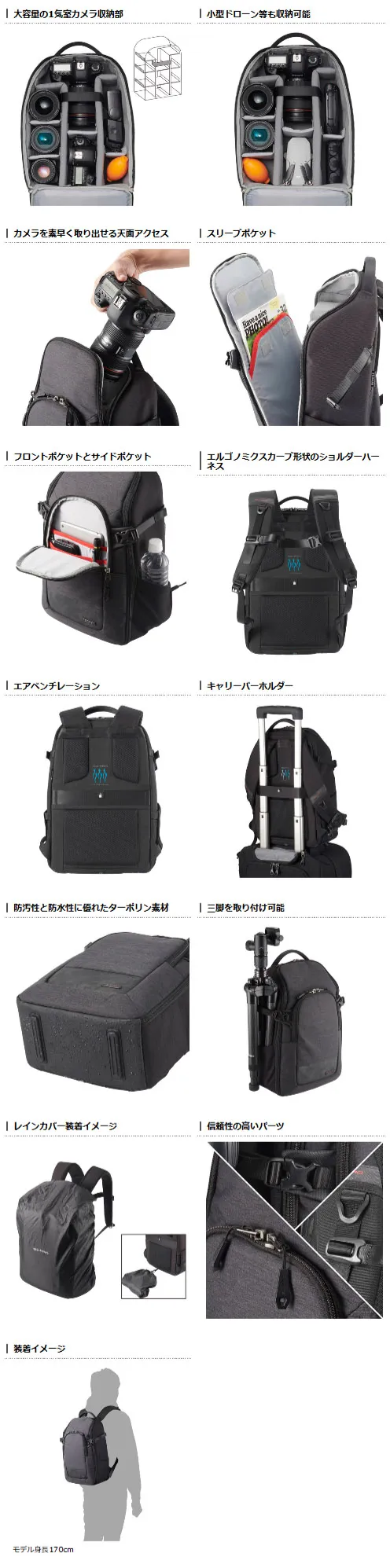 キャリーバッグに通して移動できるキャリーバーホルダーを背面に装備。底面には防汚性と防水性に優れたターポリン素材を採用しています。さらに突然の雨や汚れから機材を守る専用レインカバーを背面レインカバーポケットに装備しています。