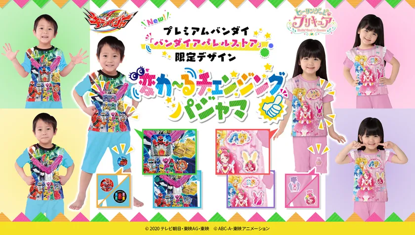 株式会社バンダイ アパレル事業部では、特撮作品「魔進戦隊キラメイジャー」及び、テレビアニメ「ヒーリングっどプリキュア」から、見る角度によって絵柄が変わって見えるシートを使用した、『変わ~るチェンジングパジャマ』(各3,190円 税込/送料・手数料別途)をバンダイ公式ショッピングサイト「プレミアムバンダイ」内バンダイアパレルストア( https://p-bandai.jp/apparel/?rt=pr )にて2020年5月18日(月)11時より、予約開始いたします。(発売元:株式会社バンダイ)