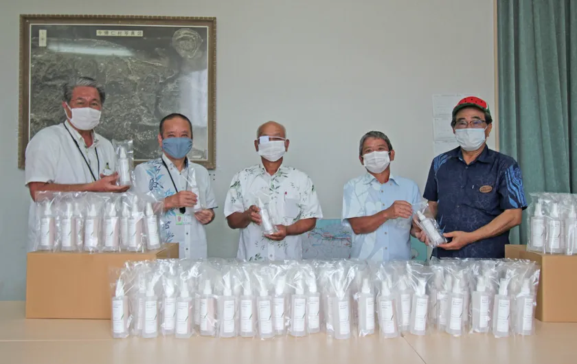 昨今の新型コロナウイルス感染症の流行に伴い、全国各地の薬局、量販店などで消毒用のアルコールが品薄な状態となりました。「人から人」だけでなく「物から人」への感染予防対策が重要とされる中、村内の医療や福祉の現場、今後子供たちの登校が再開となる学校機関でも消毒用アルコールが必要となることから、各機関で少しでも使いやすく効果の高い除菌剤をと思い、昔から沖縄の生活文化には欠かせない「月桃」が香る除菌スプレーを作りました。地元である今帰仁村へ、少しでも恩返しができればと思い、寄贈させていただきました。