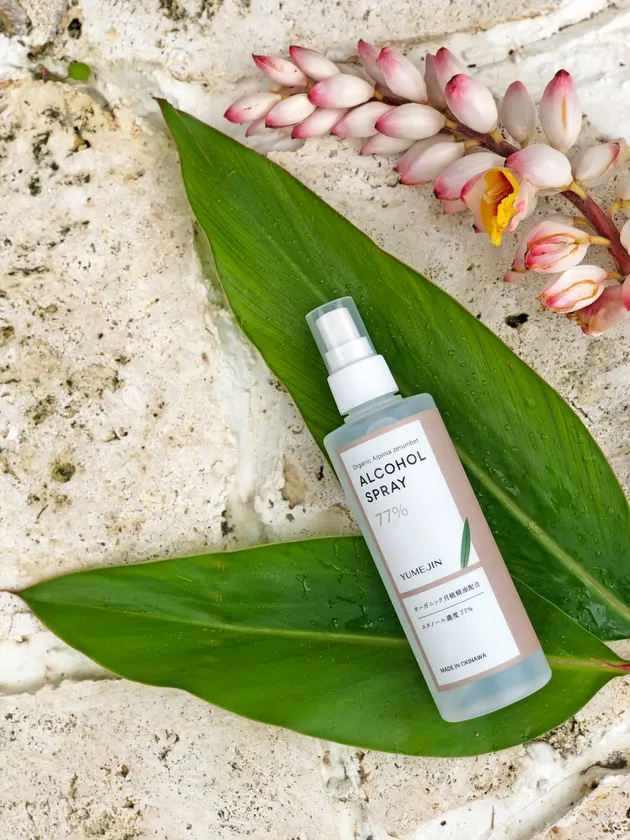 「YUMEJIN」では、今帰仁村の自社農園(有機JAS認定農園)で月桃やハイビスカスをオーガニック栽培しており、そのエキスや精油を使い「愛する家族が安心して使える製品づくり」をモットーに肌に優しいシャンプーや基礎化粧品を製造・販売を行っています。今回はリラックス効果のある月桃の精油と蒸留水を配合することで、お使いいただく方のストレスを少しでも和らげることのできること、そして消毒用エタノールの代替品としてしっかり除菌ができることを重視して月桃&アルコール除菌スプレーを作りました。※医薬品や医薬部外品ではありませんが消毒用アルコールの代替品として手指の消毒にもお使いいただけます(サトウキビ由来の植物性発酵エタノール77%)
