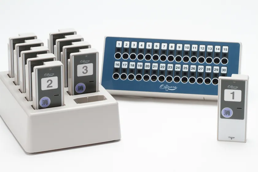 「ワンタッチコール」はフードコートでおなじみの呼び出しベルです。レジで注文し出来上がるとブザー音と振動でお知らせします。ららぽーとなどの大手商業施設や高速道路のSAなどに導入しています。