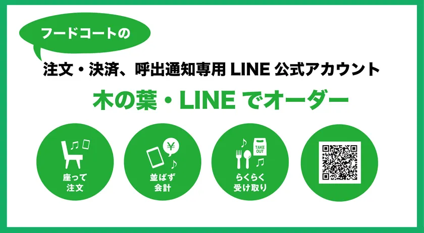 木の葉モール橋本のフードコート全店営業再開にあわせ、 「木の葉・LINEでオーダー」を一般向けに提供開始 専用アカウントから注文・決済し、 通知が来たら商品を取りに行くだけ