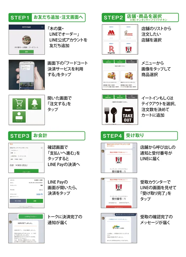 専用LINE公式アカウント「木の葉・LINEでオーダー」を友だち登録し、下部メニューから「フードコート決済サービスを利用する」を選択(STEP1)。店舗、商品、点数、イートイン・テイクアウトを選んでいき(STEP2)、LINE Payで決済(STEP3)。商品の準備が完了すると通知とともに受付番号が届き、各店舗で商品を受け取れます(STEP4)。