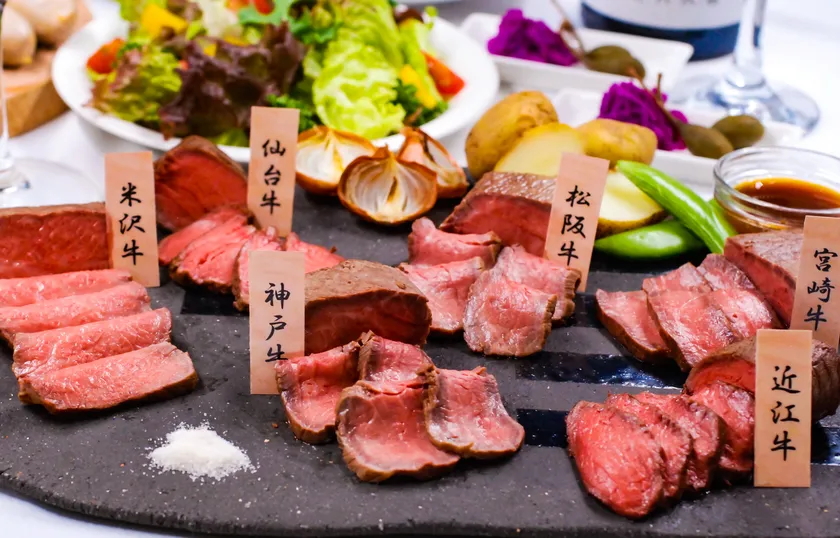 お肉は脂肪が肉に細かく入り込んで濃厚な旨みの神戸牛、“肉の芸術品”と言われる松阪牛、良質な身の締まりと脂肪ののりの良さが特徴の米沢牛、最も歴史のあるブランド和牛の近江牛、やわらかさ、味わい、色合いの素晴らしさが実感できる宮崎牛、脂肪と赤身が絶妙なバランスの仙台牛の6つのブランド和牛のモモ肉を使用。