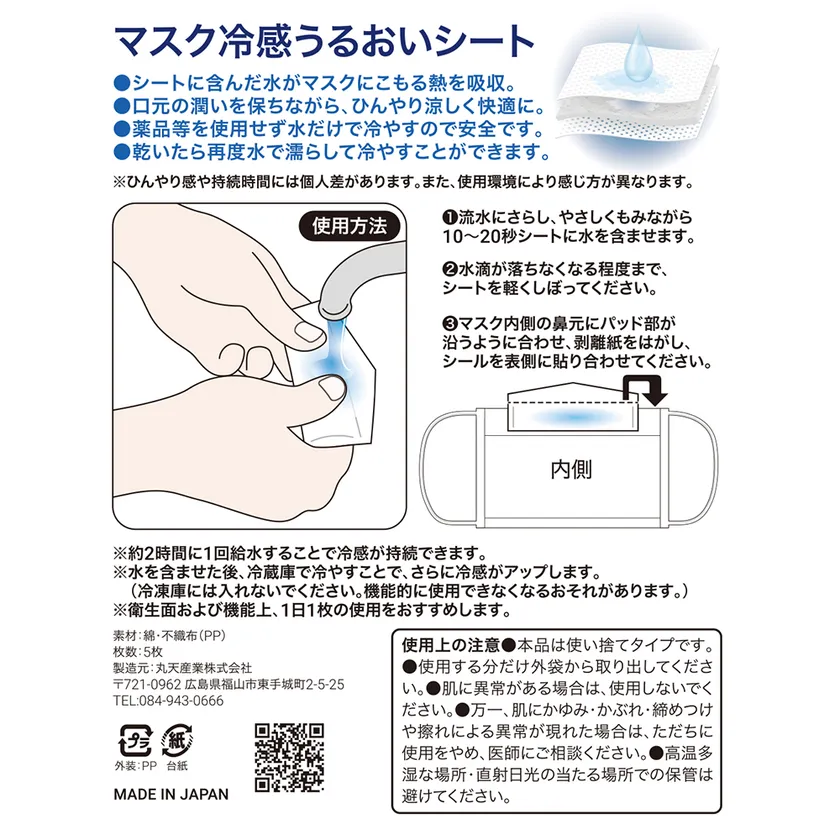 シールやマスキングテープを製造する丸天産業株式会社(本社:広島県福山市、代表取締役社長:佐藤 紘之)は、暑い時期でも快適にマスクをつけられる『マスク冷感うるおいシート』を、販売サイト「MAPURI SHOP」にて2020年5月27日(水)より発売します。※5月20日(水)より予約受付を開始。