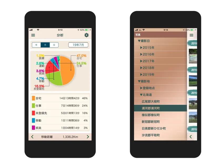 またこのアプリは利用者の移動経路や滞在施設、撮影した写真を自動取得し、それを時間とともに記録し分析します。