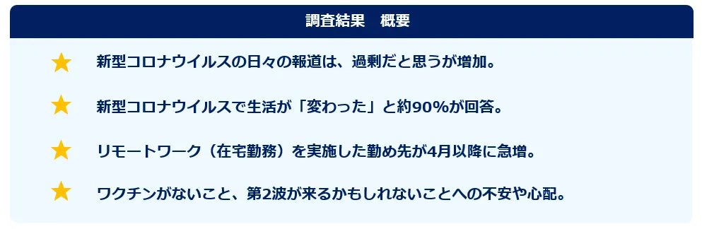 「新型コロナウイルス」により生活が「変わった」と約90%が回答。 「ワクチン」がないこと、「第2波」が来るかもしれないことへの不安や心配が見られる。 ーインサイトテック ユーザーアンケートー