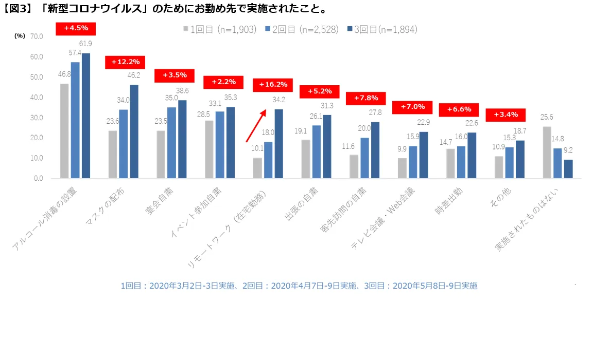 3:リモートワーク(在宅勤務)を実施した勤め先が4月以降に急増。(図3)