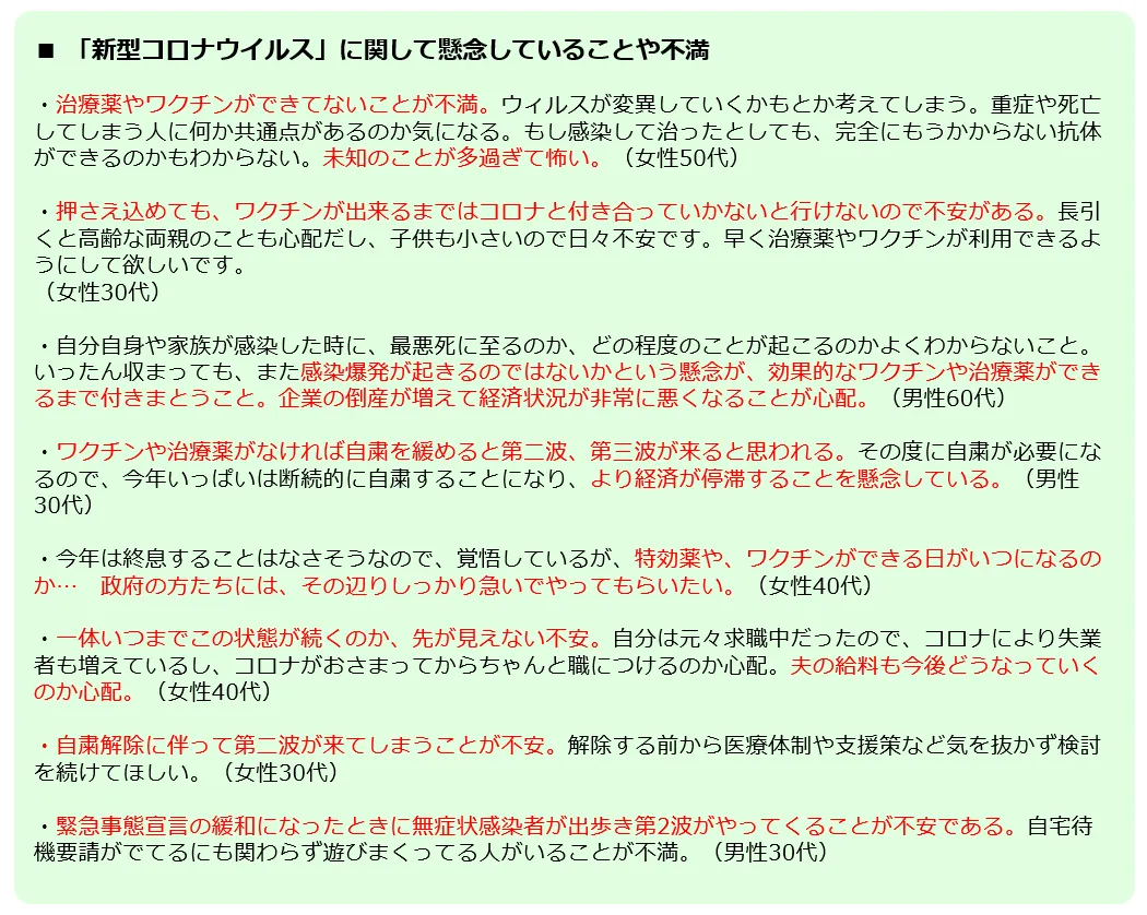 「新型コロナウイルス」に関して懸念していることや不満を確認したところ、 3回目は2回目と比較して、ワクチン、治療薬がないことへの不安、第2波が来るかもしれないことへの恐怖、家計や日本経済への影響について心配する声が多くなっています。今まであまり見られなかった今後の状況に関する内容が特徴的です。具体的な回答者の声も紹介します。