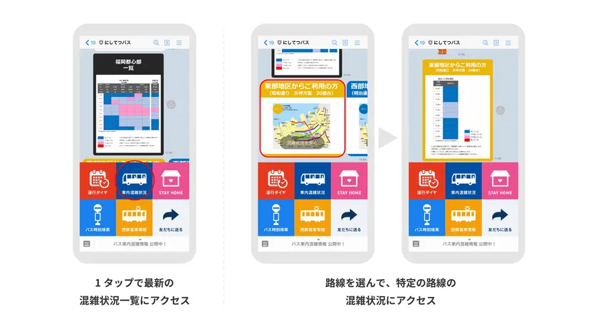 西日本鉄道のバスおよび電車の利用者は、LINE公式アカウントから混雑状況を確認し、時差出勤時等において混雑回避の参考情報として活用いただけます。