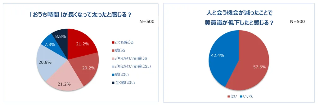 先述のように多くの女性が「巣ごもり太り」を実感し、洋服や下着のサイズが小さくなったという弊害に直面していることが明らかになりました。このような体型の変化には運動不足や食事だけでなく、“他人から見られている意識”も影響を与えていると考えられます。実際に、外出自粛により人と会う機会が減ったことで、美意識が低下したと感じている女性は半数以上いることが分かりました(57.6%)。人の目に触れる機会が少ないと、美意識のモチベーションを保つことは難しいようです。
