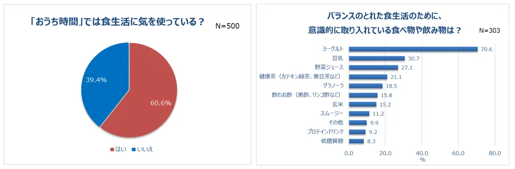 さらに「食生活に気を使っている」と回答した人を対象に、バランスのとれた食生活のために意識的に取り入れている食べ物や飲み物を調査したところ、「ヨーグルト」(70.6%)が圧倒的に多く、その後に「豆乳」(30.7%)、「野菜ジュース」(27.1%)という回答が続きました。比較的手軽に取り入れやすく、健康的なイメージのあるものを意識的に取り入れていることが分かりました。