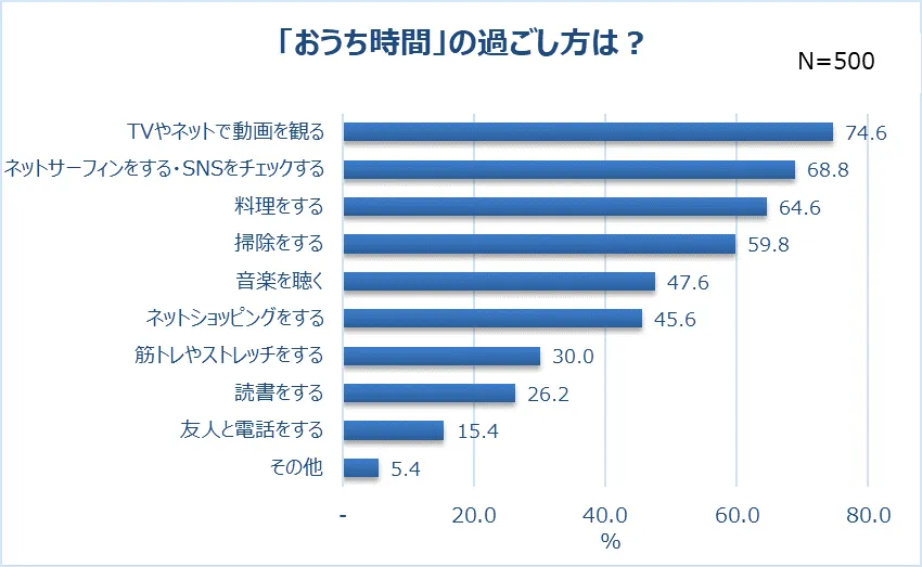 1.おうち時間の過ごし方は“ゆっくり派”が多数。最も多いのは「TVやネットで動画を観る」(74.6%)