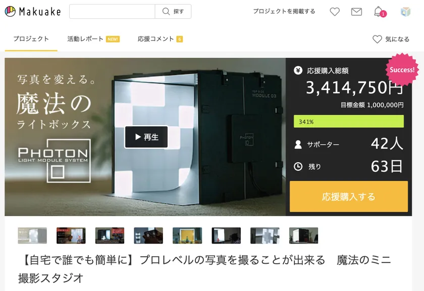 ▼プロジェクト:自宅で誰でも簡単にプロレベルの写真を撮ることが出来る。魔法のライトボックス「Photon Light Module System(フォトンライトモジュールシステム)」紹介ページ(クラウドファンディングサイト「Makuake(マクアケ)」)