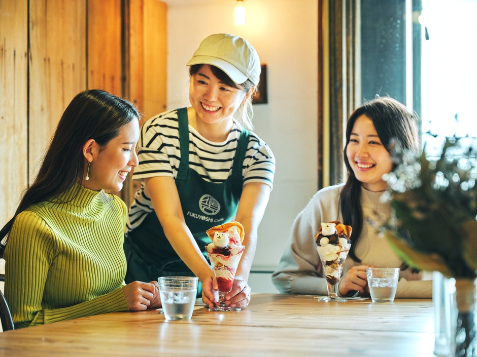 OMO7旭川の周辺には、少し歩くとおしゃれなカフェが点在しており、日常から離れてホッと一息つけるスポットが多くあります。シロクマバレンタインルームを堪能したら、ご近所へ飛び出してお散歩へ。シロクマバレンタイン女子会にちなみ、ホテルから徒歩10分ほどのところにある「福吉カフェ」で特製の「シロクマスイーツ」を楽しむことができます。プラン予約者には、シロクマスイーツを食べることができるチケット付き!福吉カフェ特製のシロクマスイーツで、カフェでも女子会が盛り上がること間違いなし!