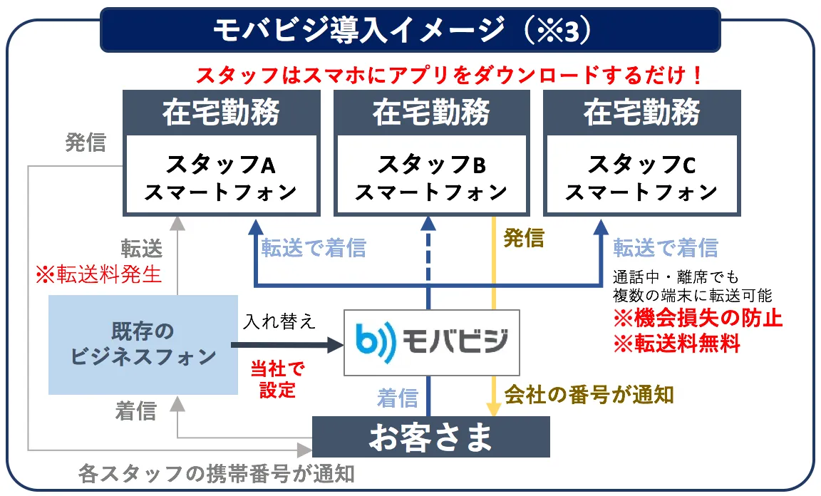 回線に付随する転送機能を活用し、会社から各個人の指定の携帯に設定すればお客さまからの電話を受けることは可能です。しかし、1.発信時は携帯番号通知されてしまう、2.複数の端末に着信ができない、3.スタッフへの取次ができない、4.転送時の通話料が発生するなどの課題が残ります。
