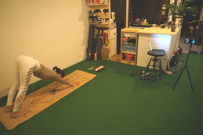 今回は、都内某所のパーソナルトレーニングジムをお借りして、オンラインヨガ教室を開催しました。