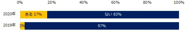 「テレワークの制度を使って働いたことはありますか?」と伺ったところ、17%が「ある」と回答。昨年より14ポイント増加しました。「テレワークの制度を使って働いたことがある」と回答した方にテレワークという働き方を選んだ理由を伺うと、「コロナウィルス感染拡大など、非常事態だったから」(67%)が最多。2019年の結果と比較すると、新型コロナウイルスの影響が大きいことがわかります。