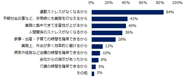 理由を伺うと、「通勤ストレスがなくなるから」(84%)が最多。次いで、「予期せぬ災害など、非常時にも業務を行なえるから」(42%)、「業務に集中できて生産性が上がるから」(40%)が続きます。具体的なエピソードも紹介します。
