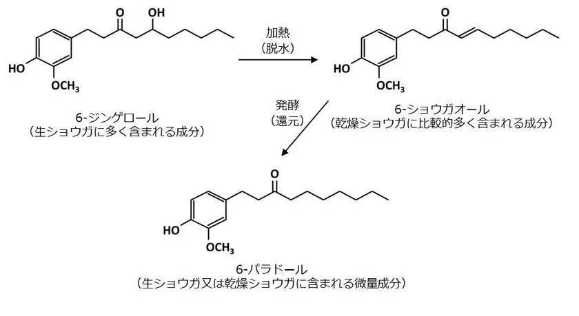 6-パラドールは、ショウガ科植物特有の辛味成分であり、一般的なショウガにごく微量しか含まれていない機能性成分です。生ショウガの精油中の主な辛味成分である6-ジンゲロールは、加熱等の処理によって脱水反応が起こり、6-ショウガオールへと変化します。6-ショウガオールがさらに還元されることで、6-パラドールへと変化します。6-パラドールは上記二成分とは、異なる機能性を示すことが確認されており、代表的なものとして抗肥満作用や抗炎症作用が報告されています。