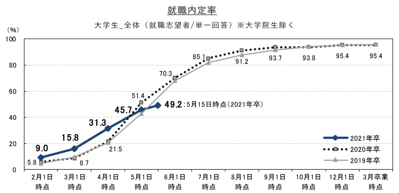 就職内定率は49.2%、5月1日時点比+3.5ポイント。 対面での採用活動は引き続き制限も、理系を中心に動き出す