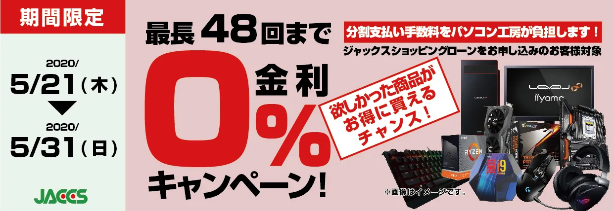 パソコン工房・グッドウィルを運営する株式会社ユニットコム(代表取締役:端田 泰三、本社:大阪市浪速区)は、パソコン工房 Web サイトおよび全国のパソコン工房・グッドウィル各店舗にて、ジャックスショッピングローンをご利用の場合、分割支払い金利手数料が最長 48 回まで無料になる『ショッピングローン 0%金利キャンペーン』を 2020 年 5 月 21 日(木)より開始しました。