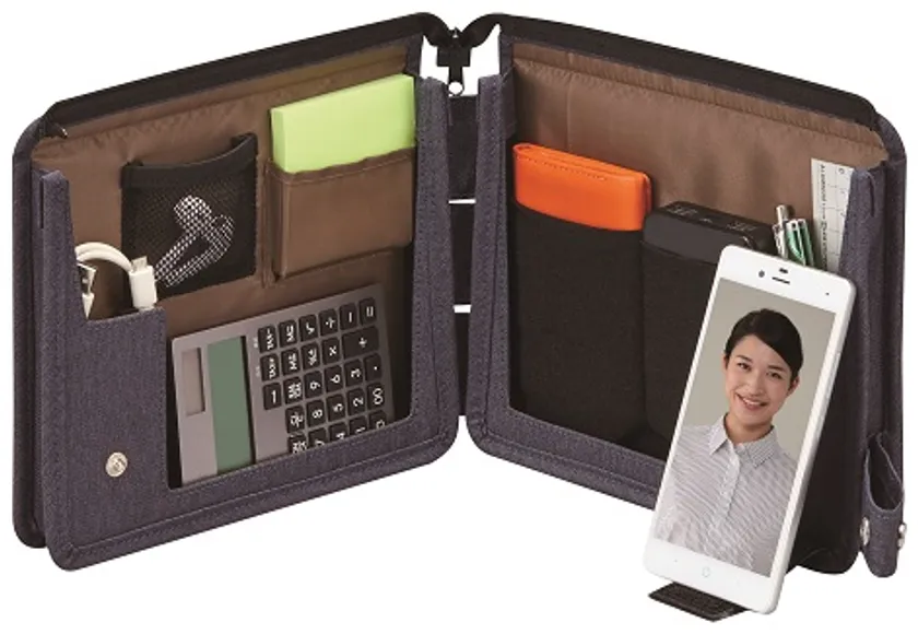 テレワーク環境で必要な小物類を分類収納できるバッグです。L字に開いて自立するので狭い場所でも広げることができます。