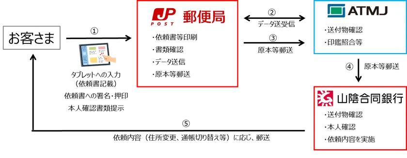 日本ATMのシステムを活用し、山陰合同銀行のお客さまの住所・氏名変更などの手続事務の受付サービスを郵便局で提供します。