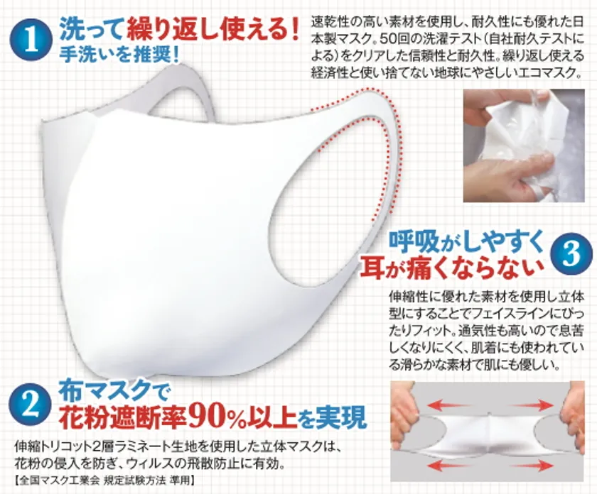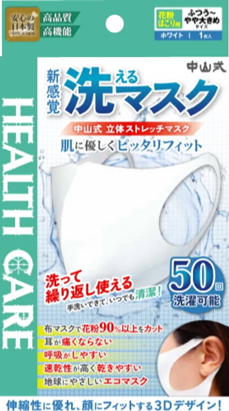 「中山式 立体ストレッチマスク」は肌に優しくピッタリとフィットする伸縮素材を使用した耳が痛くならないマスク。布マスクとして花粉遮断率90%以上を実現した伸縮トリコット2層ラミネート生地を使用しているので飛散防止にも有効です。乾きやすく、洗って繰り返し使える(50回洗濯可能)ので「使い捨てる」抵抗感が無く地球にやさしく経済的です。しっとりした肌ざわりなので不織布マスクの肌荒れが気になる方にもおススメです。
