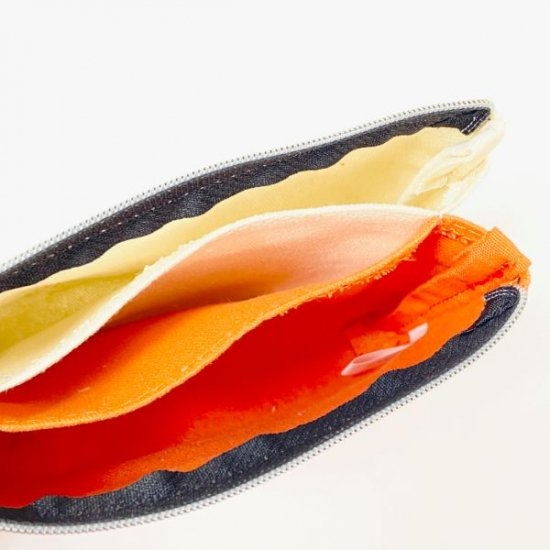 反対側はきれいなオレンジカラー♪ファスナーを開けると3つの部屋に分かれていて、仕分けしながら小物を持ち運べて便利です。