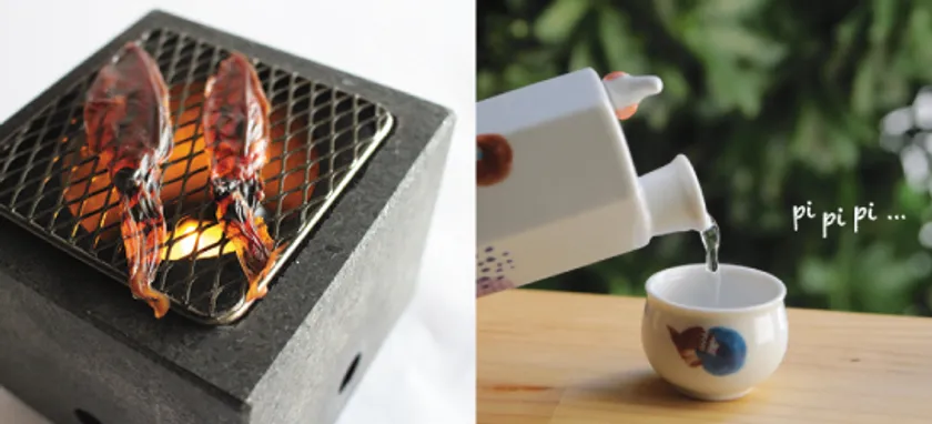 “石乃炙り鉢”は、御影石で作られた器に入れたティーキャンドルや炭によっておつまみを炙ることで、より美味しく味わうことができます。“鳴き徳利”は内部が特殊な構造となっており、お酒を注ぐと「ピヨ、ピヨ」と鳥がさえずるような音が出て、ついつい何度もお酒を注ぎたくなる徳利です。