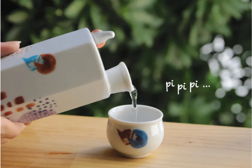 そっとお酒を注ぐと、ピーッ、ピヨッ、と心地の良い音を響かせる鳴き徳利です。徳利の内部は特殊な構造で、空気の出入りにより、鳥のさえずりのような音が鳴る仕組みになっています。