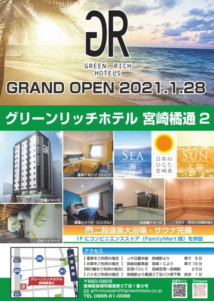 株式会社グリーンホテル・ズ コーポレーション(本社:福岡県久留米市 代表取締役社長:岡村隆裕)は、2021年1月28日(木)に宮崎県で2店舗目となる「グリーンリッチホテル 宮崎橘通2」をオープン予定です!